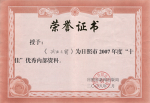 ·2007年,《興業(yè)之窗》被日照市新聞出版局評(píng)為日照市十佳優(yōu)秀內(nèi)部資料