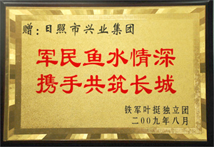 ·2009年8月,鐵軍獨立團贈日照興業(yè)集團有限公司:軍民魚水情、攜手共筑長城