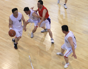 在比賽過程中各支代表隊都發(fā)揮出了極高的水平,為觀眾奉獻了一場場精彩的比賽。尤其在9月20日上午的交叉賽中,興業(yè)汽配代表隊與天泰鋼結(jié)構(gòu)代表隊勢均力敵,比賽中雙方比分交替上升,離結(jié)束還有不到20秒時,汽配代表隊61:58領(lǐng)先3分并持有球權(quán),此時汽配隊員的心理感覺穩(wěn)操勝券,一個不經(jīng)意的走步把球權(quán)送給對手,離結(jié)束不到2秒,鋼構(gòu)中鋒馬沖順勢強攻,一記精準(zhǔn)的3分遠投, 將比分追成61平,使比賽拖進加時。在加時賽中,汽配中鋒崔冰連續(xù)中投得手,興業(yè)汽配代表隊最終以73:65的比分完勝鋼構(gòu),躋身本屆籃球比賽的冠、亞軍決賽。因為天氣原因,9月20日下午的半決賽、決賽和驥翼組籃球表演賽改在日照一中室內(nèi)籃球場舉行。半決賽、決賽異常激烈,特別是在興發(fā)和汽配之間進行的決賽,展示了興業(yè)集團籃球的實力和水平,興發(fā)隊員們一次次嫻熟的配合,一個個精彩的扣籃,不時獲得現(xiàn)場觀眾的陣陣喝彩和掌聲。集團驥翼隊與興發(fā)驥翼隊的籃球表演賽同樣上演了群雄大戰(zhàn),集團驥翼隊在王建國總經(jīng)理帶領(lǐng)下,抗拒了體力不足,堅持打滿全場,最終以44:44的比分和興發(fā)驥翼隊握手言和(因?qū)俦硌葙惒辉偌訒r),也宣告興業(yè)集團第五屆職工運動會籃球比賽鳴金收兵。